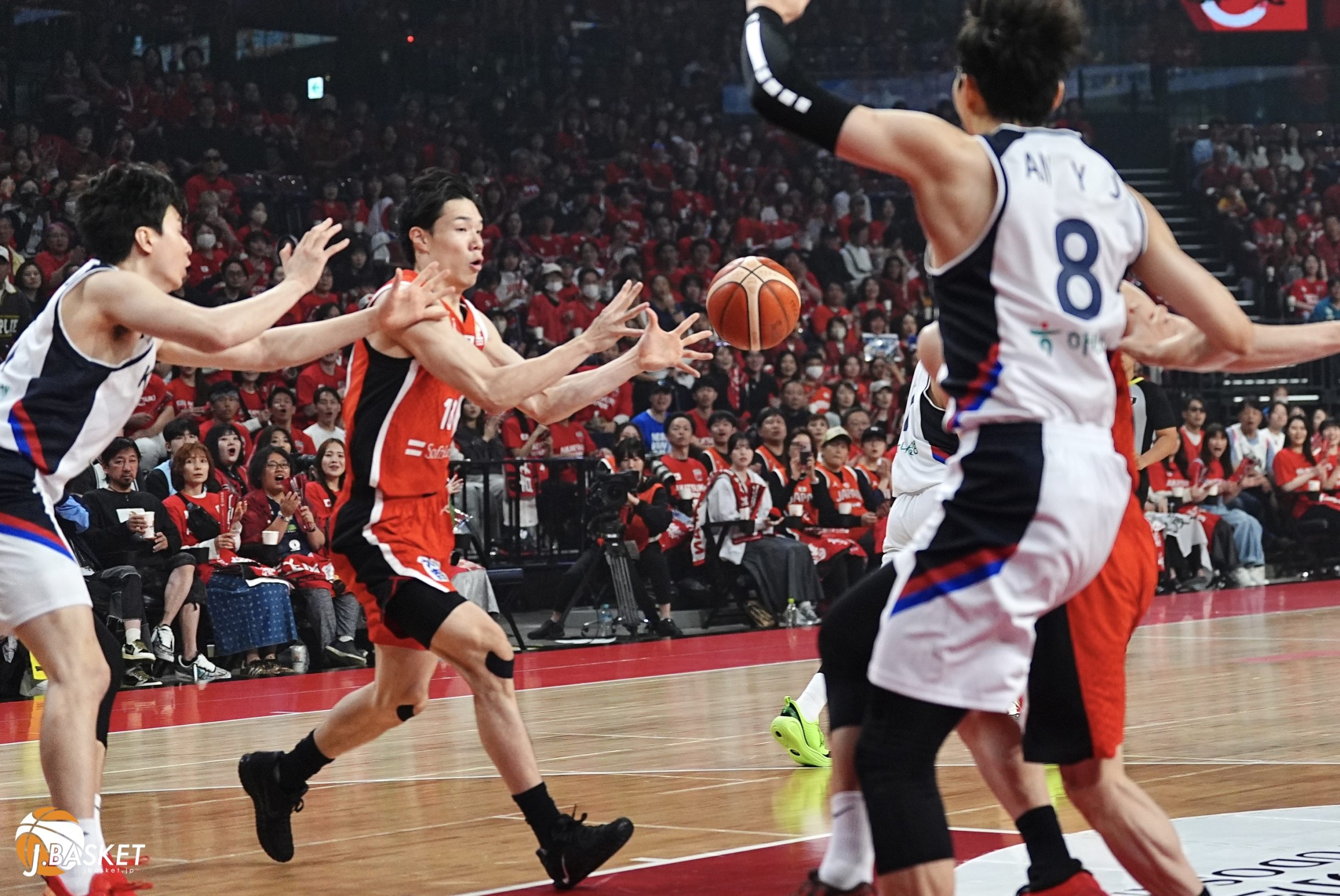 ワールドカップ予選となった日韓戦は、伝統的に熱を帯びる一戦。この日も一進一退の攻防を繰り返し、コート上の激しいプレーと沖縄の大声援が重なり、会場は最高潮の雰囲気に包まれた。